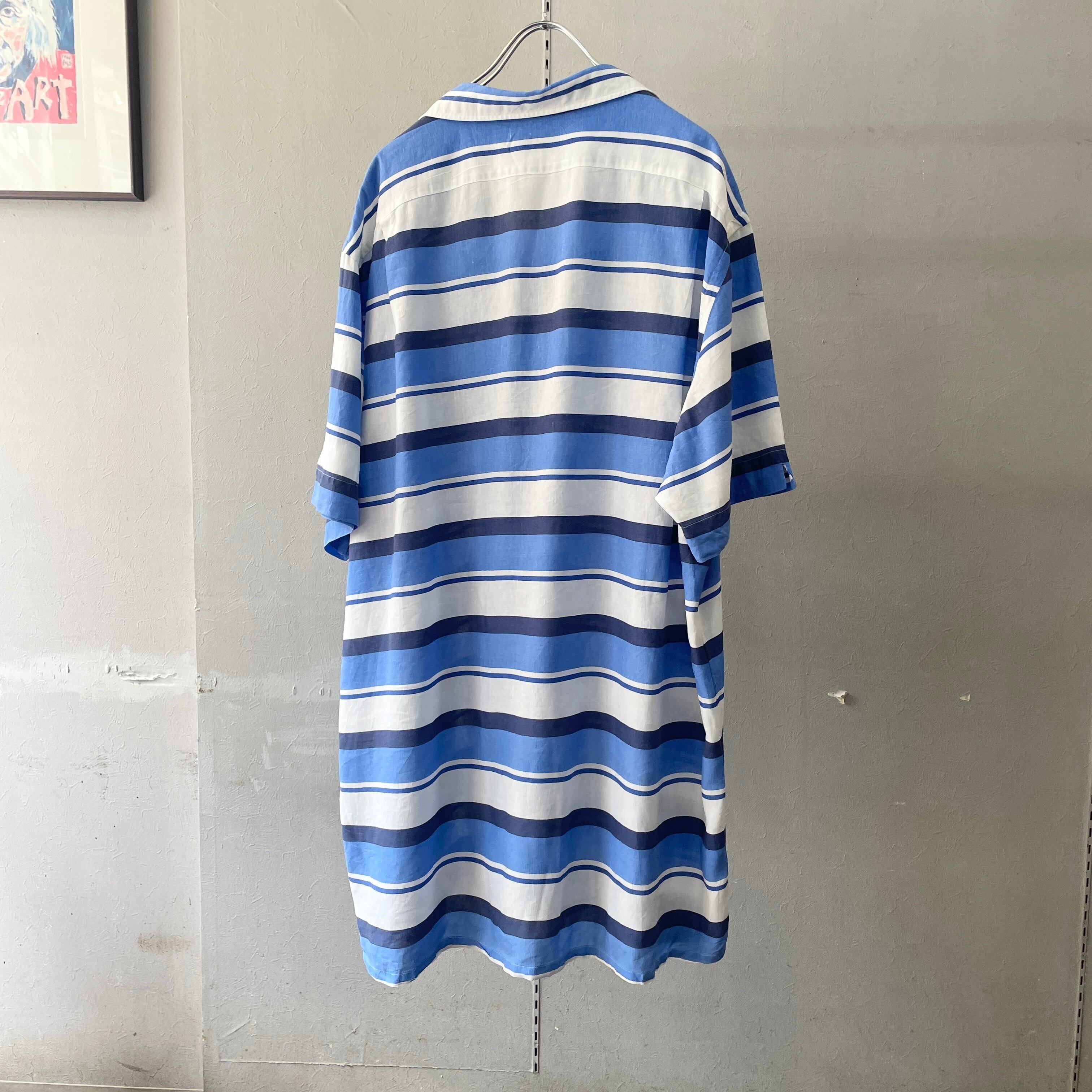 00s ラルフローレン 開襟ボーダーシャツ リネン×コットン ブルー×ホワイト XXL