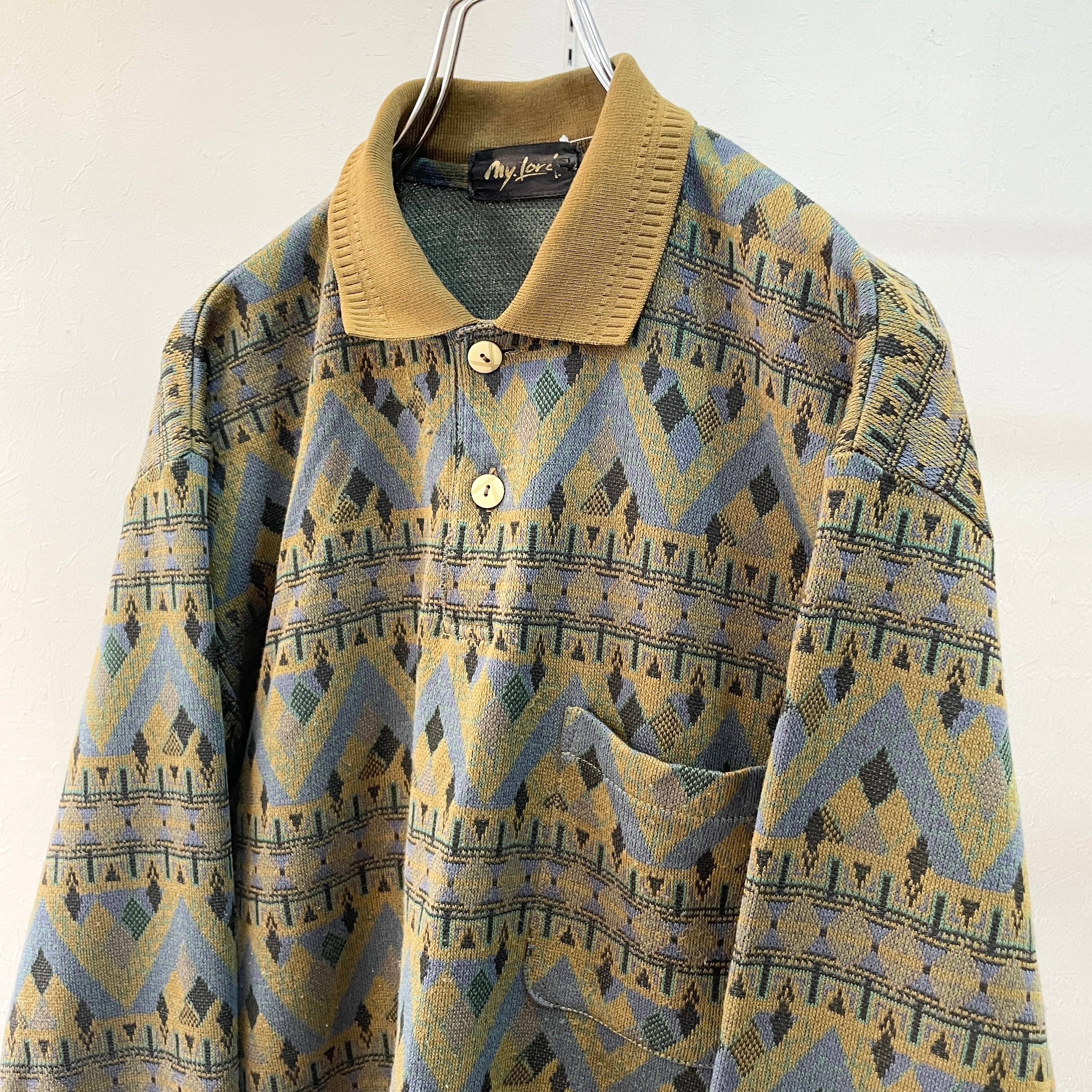 90s 総柄ニットポロシャツ カーキ×ブルー L