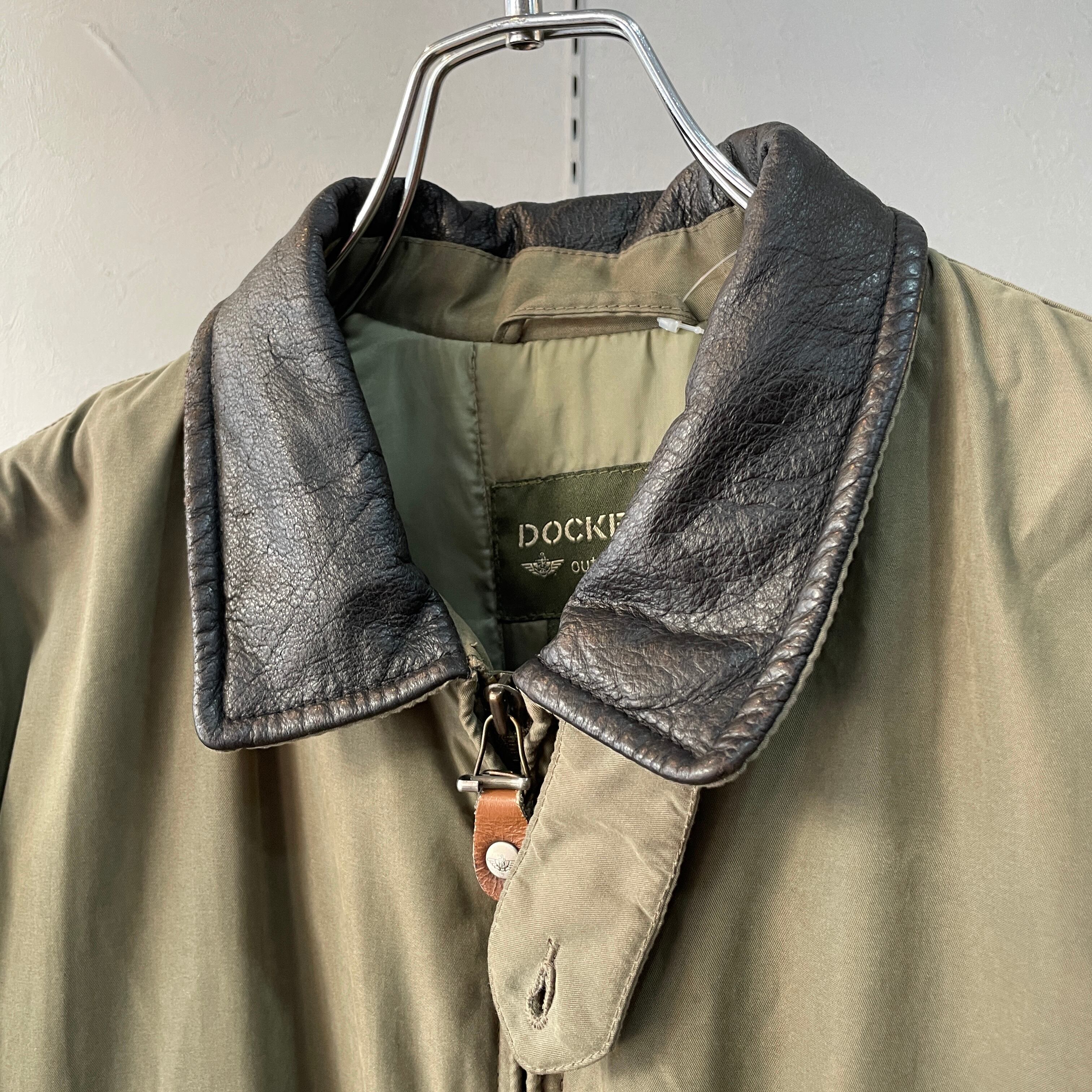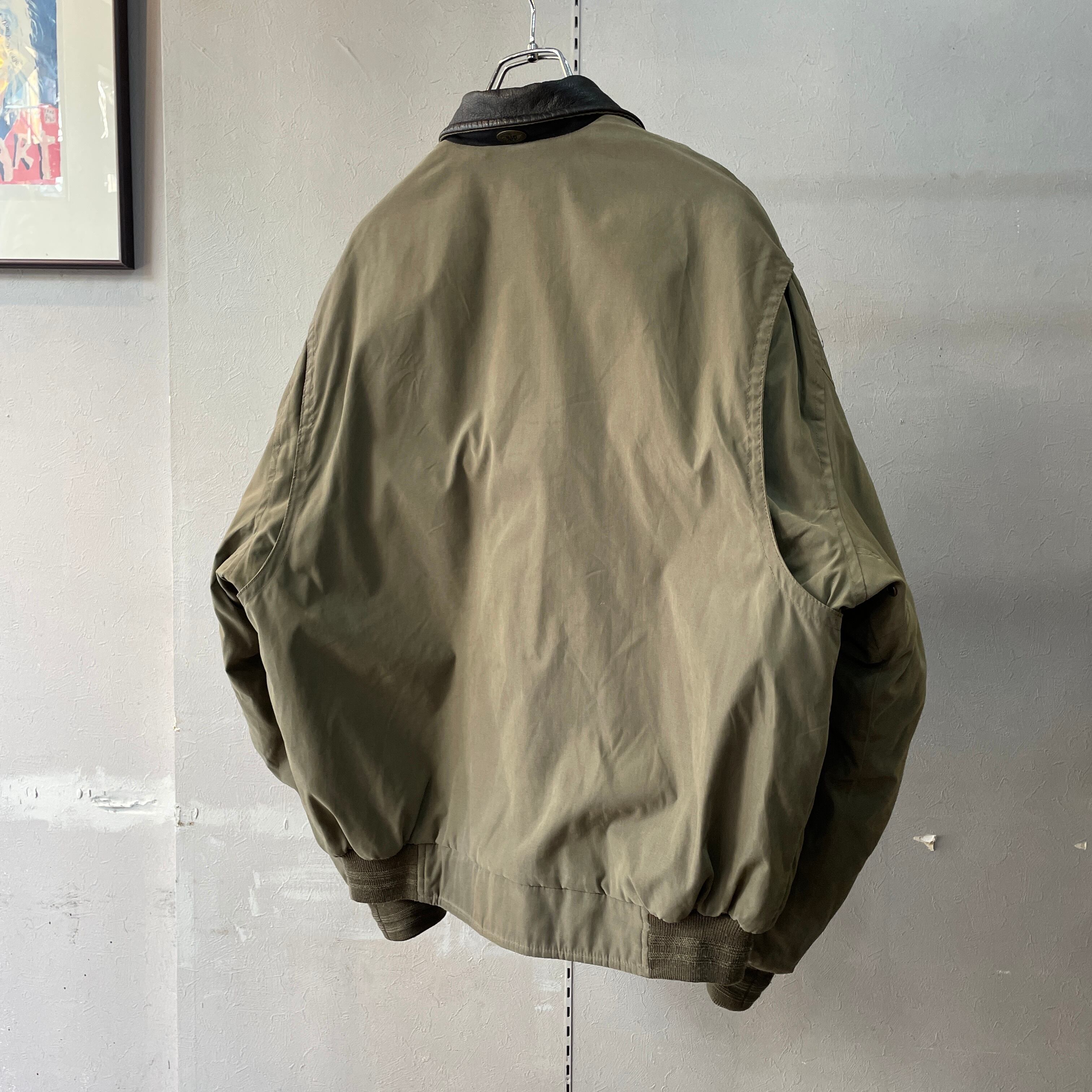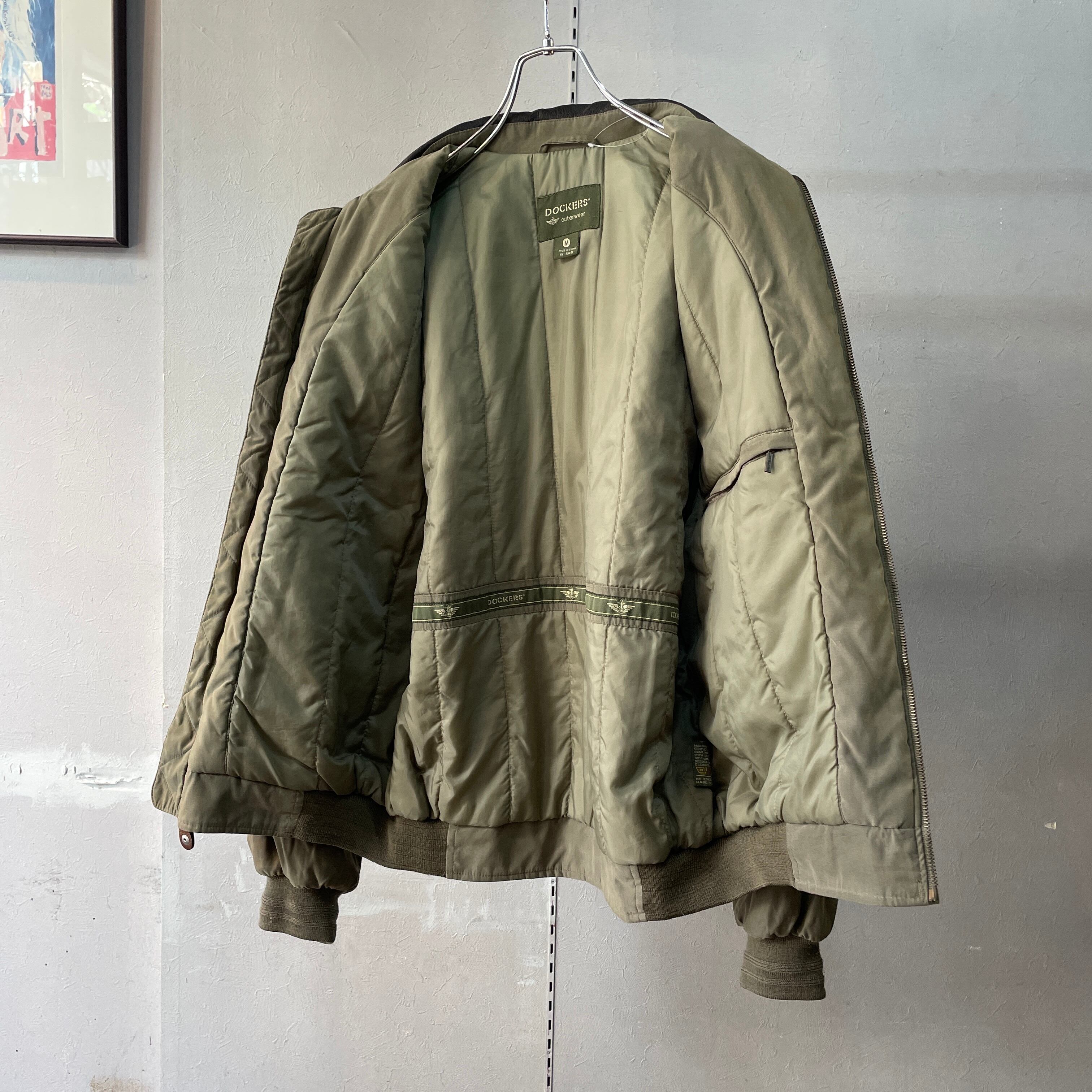 90s ドッカーズ A-2フライトジャケット型 スムースポリ 襟レザー切替 スイングトップ 中綿入り オリーブ×ブラック M