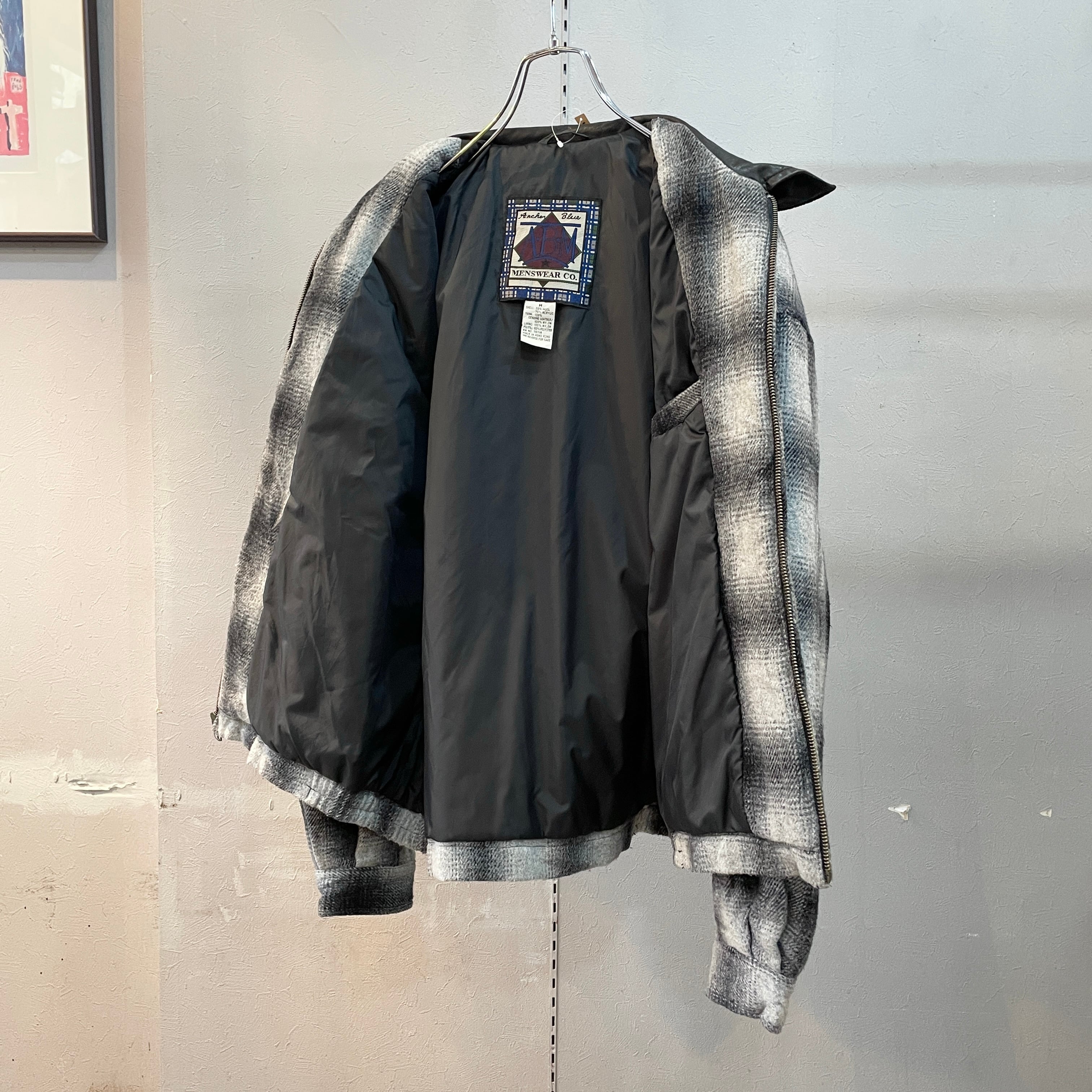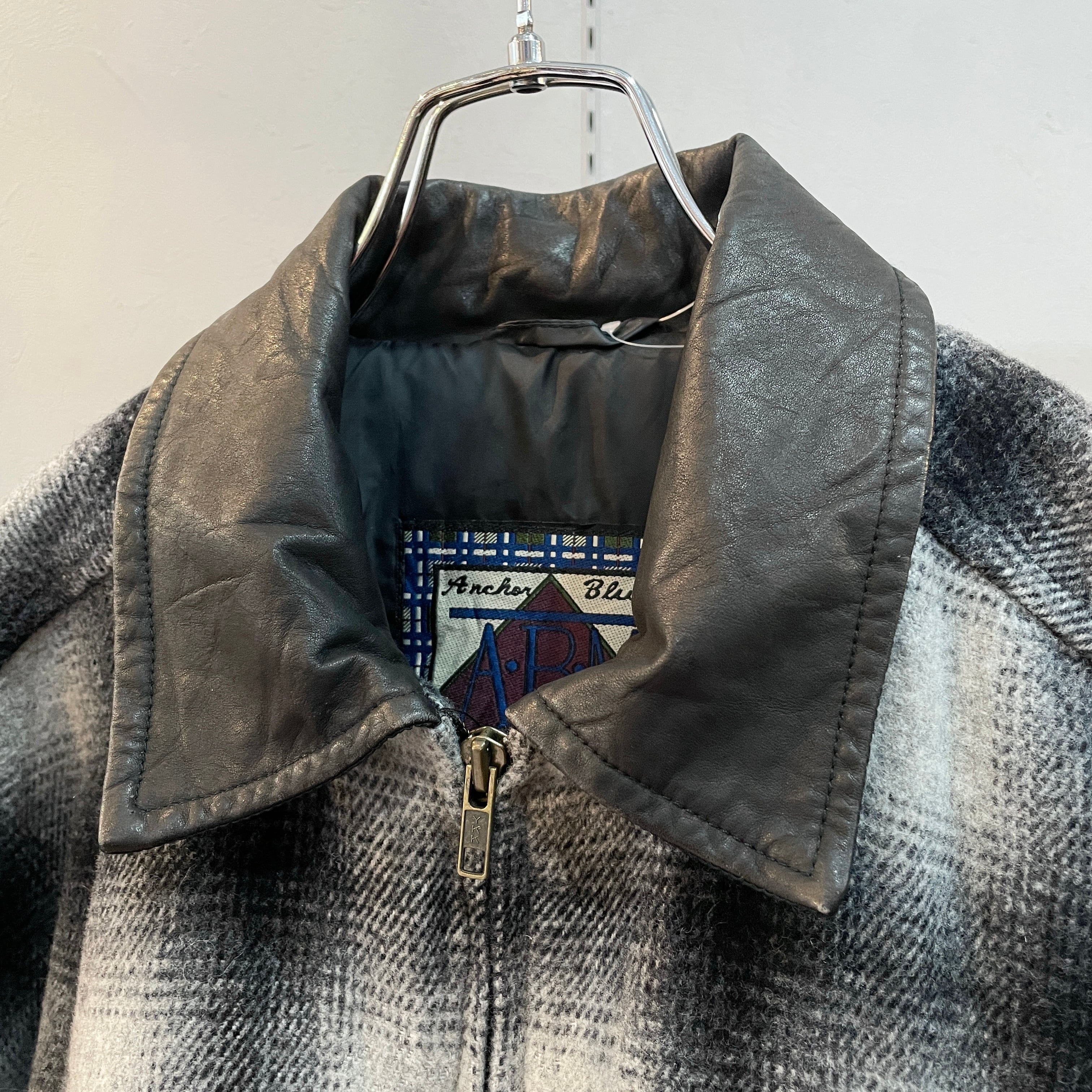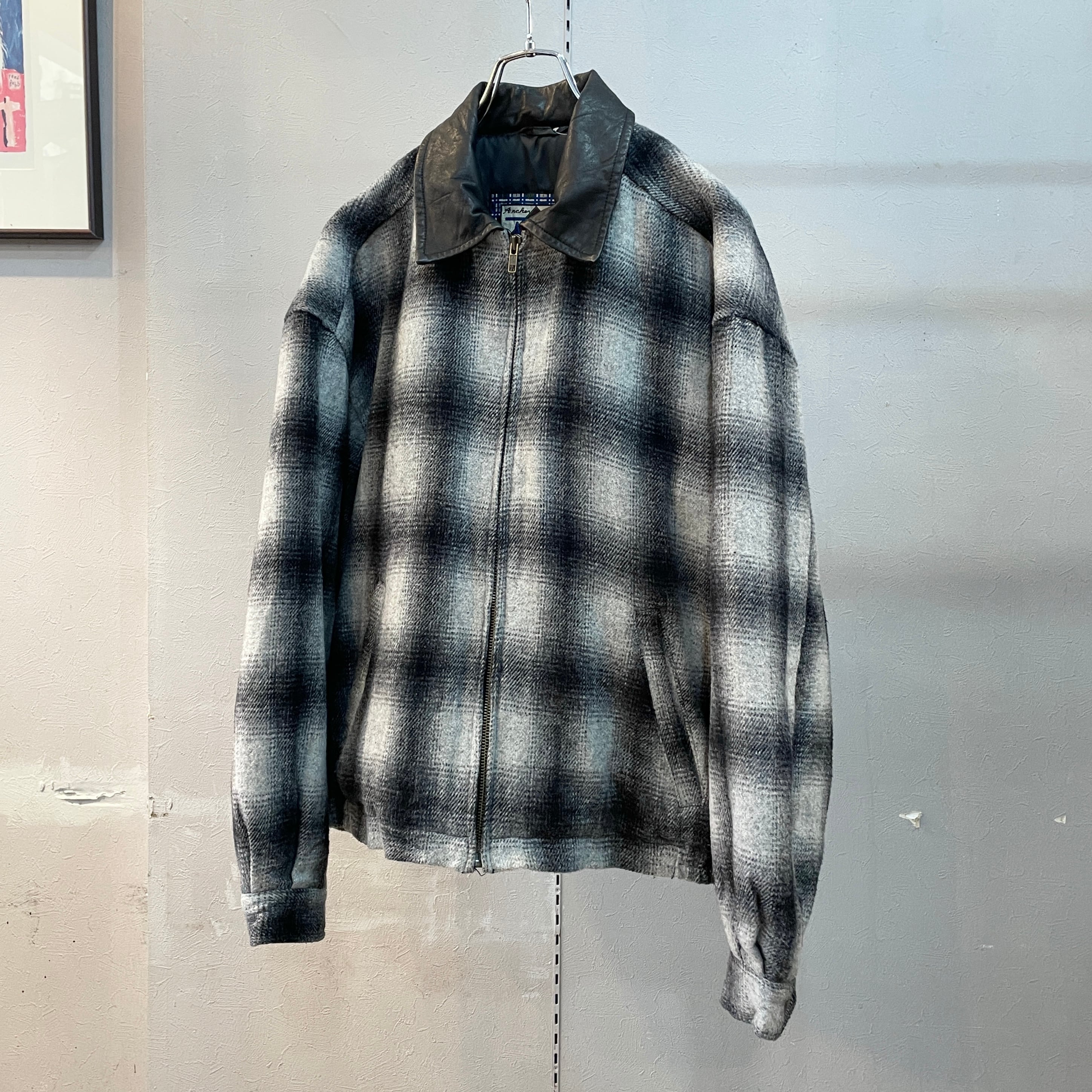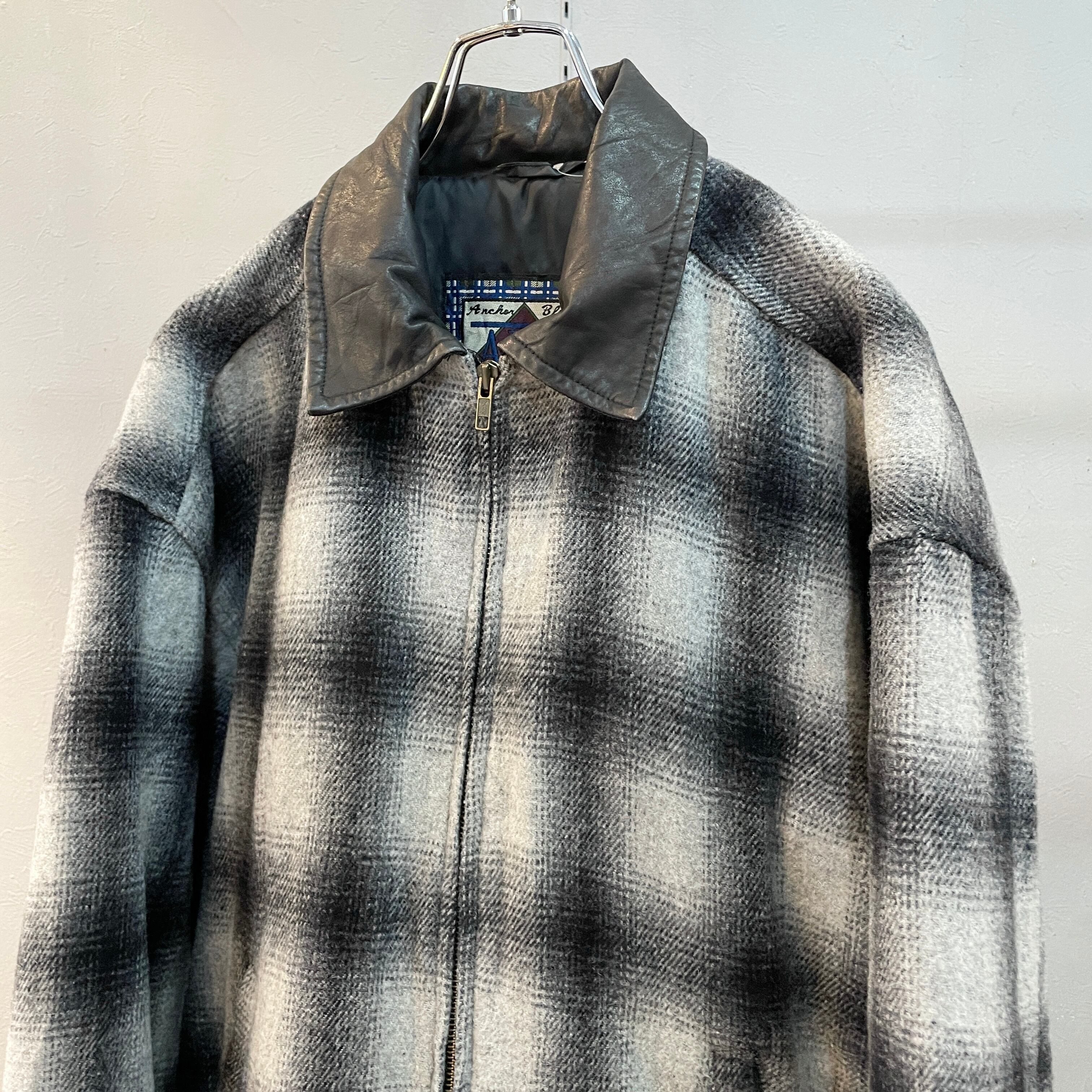 90s アンカーブルー オンブレウールスイングトップ ドリズラージャケット 襟レザー ブラック×ホワイト M
