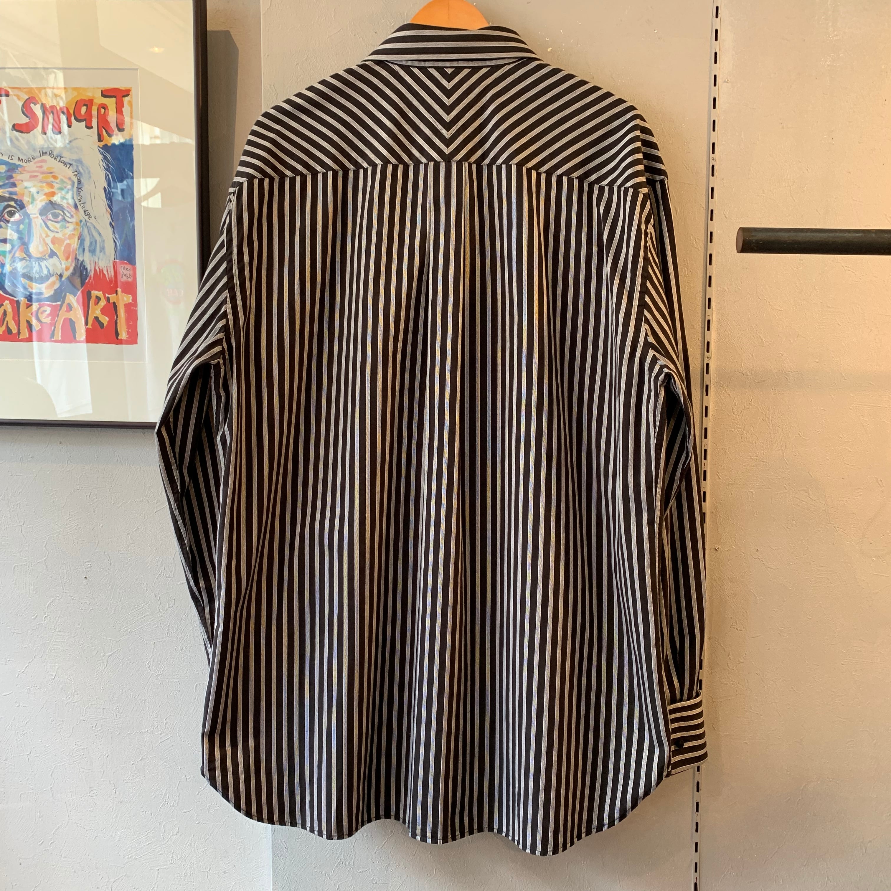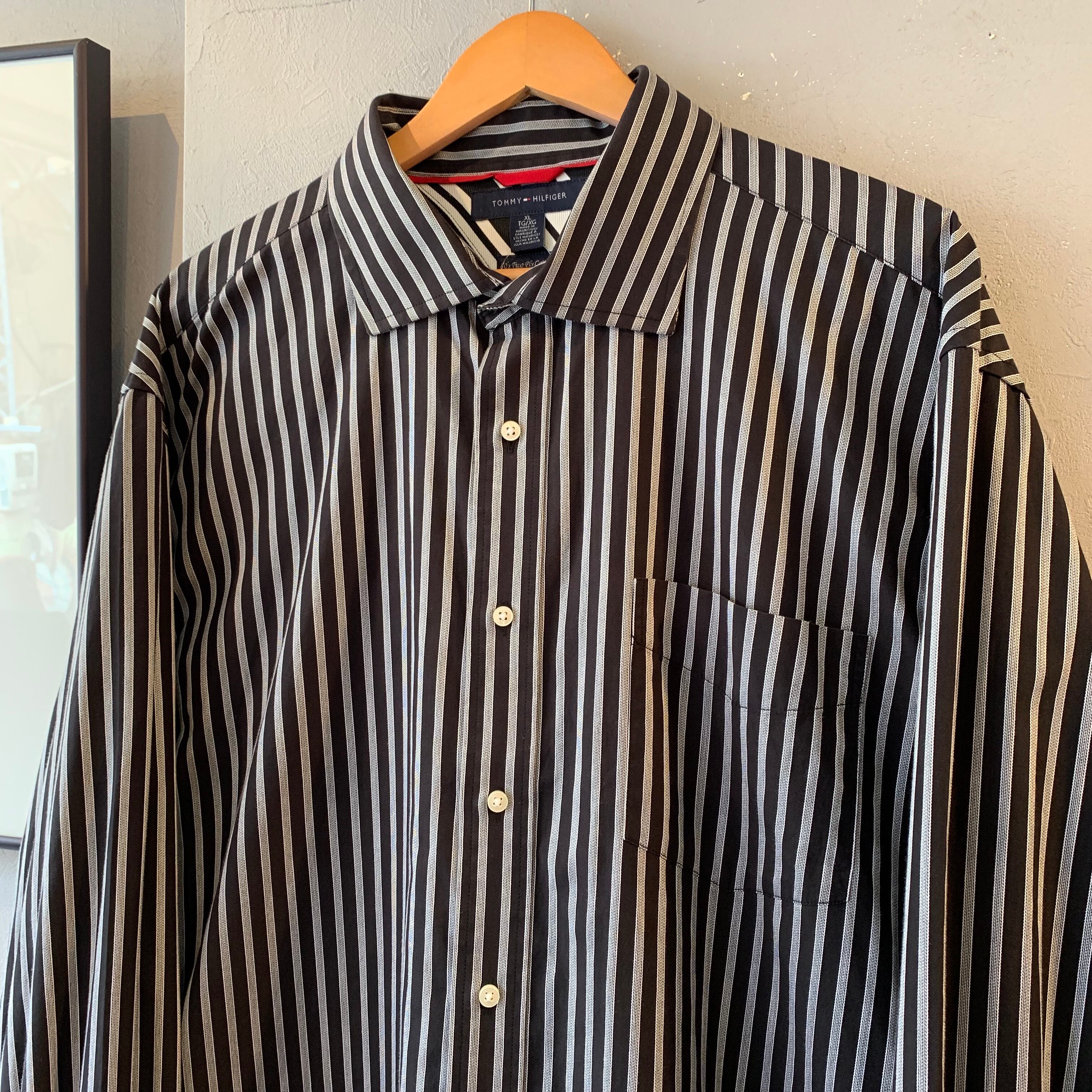 90s トミーヒィルフィガー ホリゾンタルカラー ストライプシャツ 2プライコットン ダブルカフス ブラック×ホワイト XL