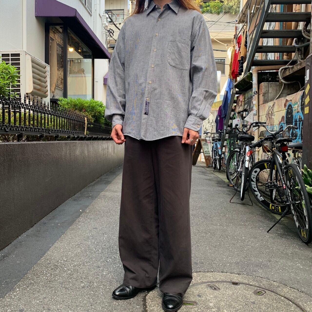 90s ハウンドトゥース 千鳥格子 コットン リネン ロングスリーブシャツ XL