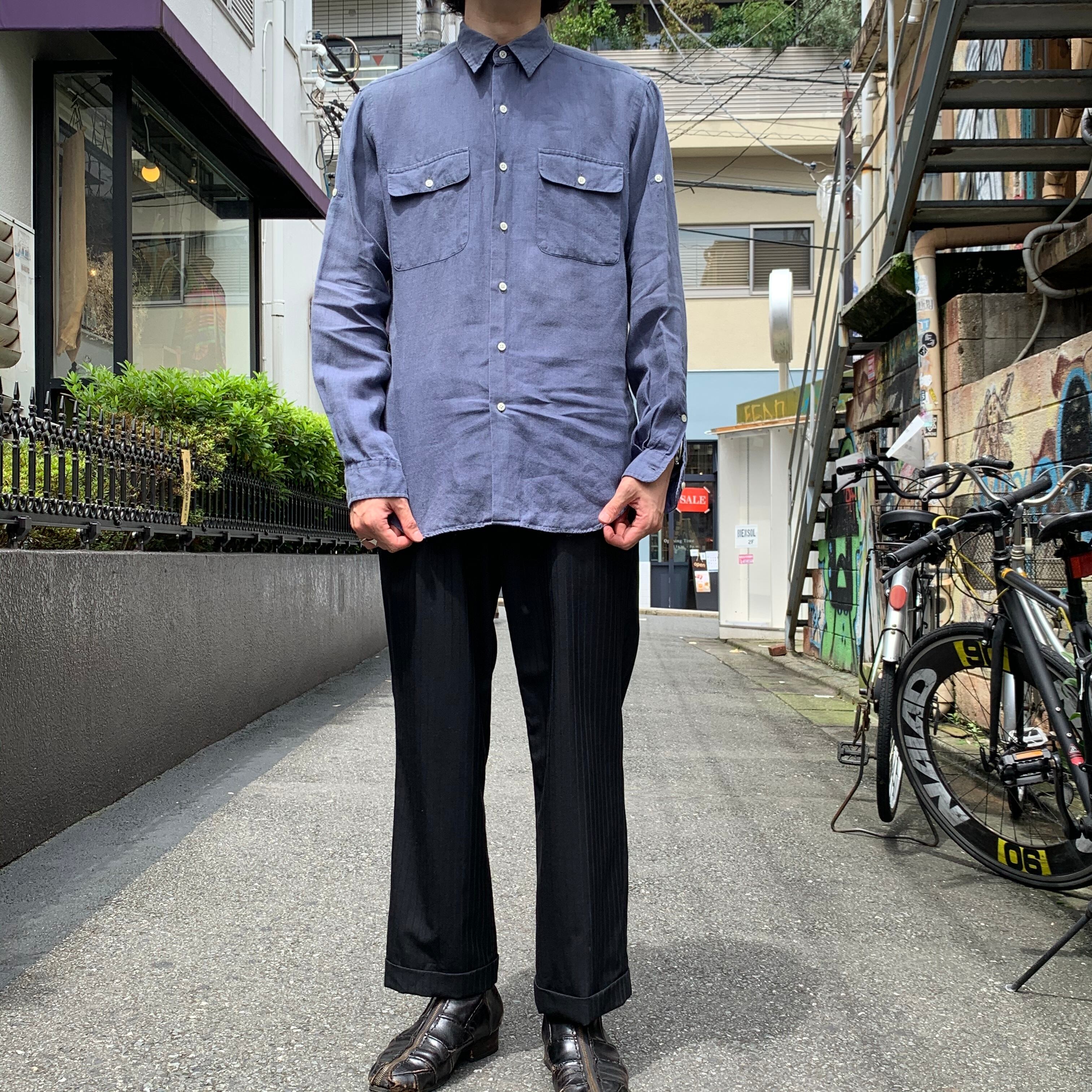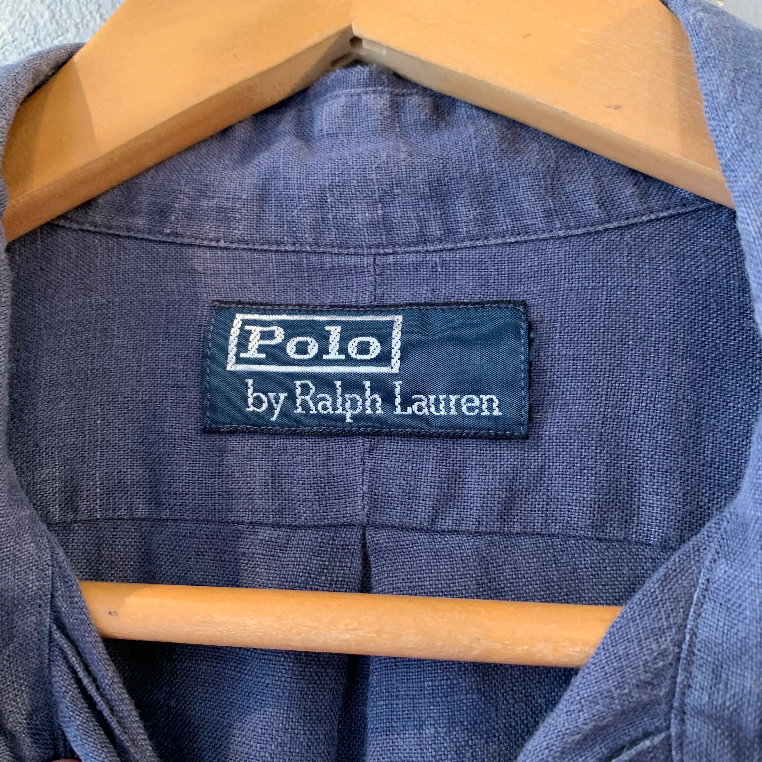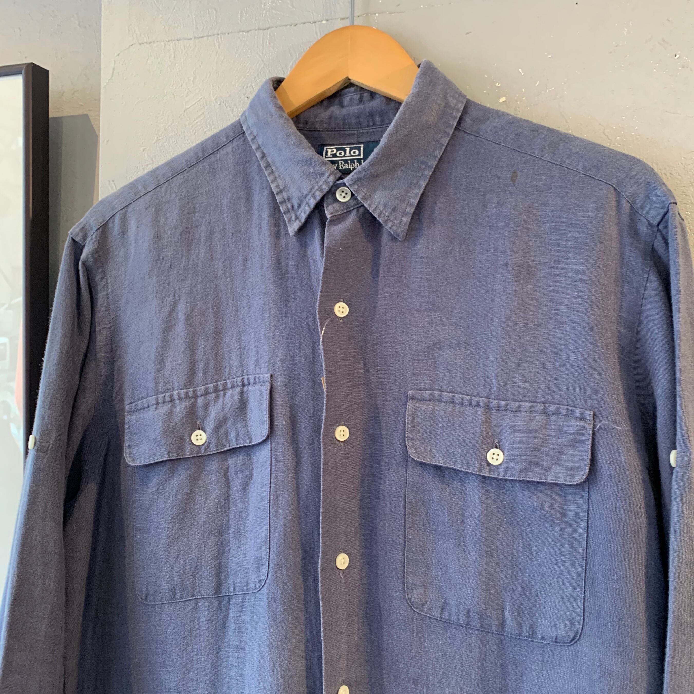 90s ラルフローレン リネンワークシャツ ブルーグレー M L