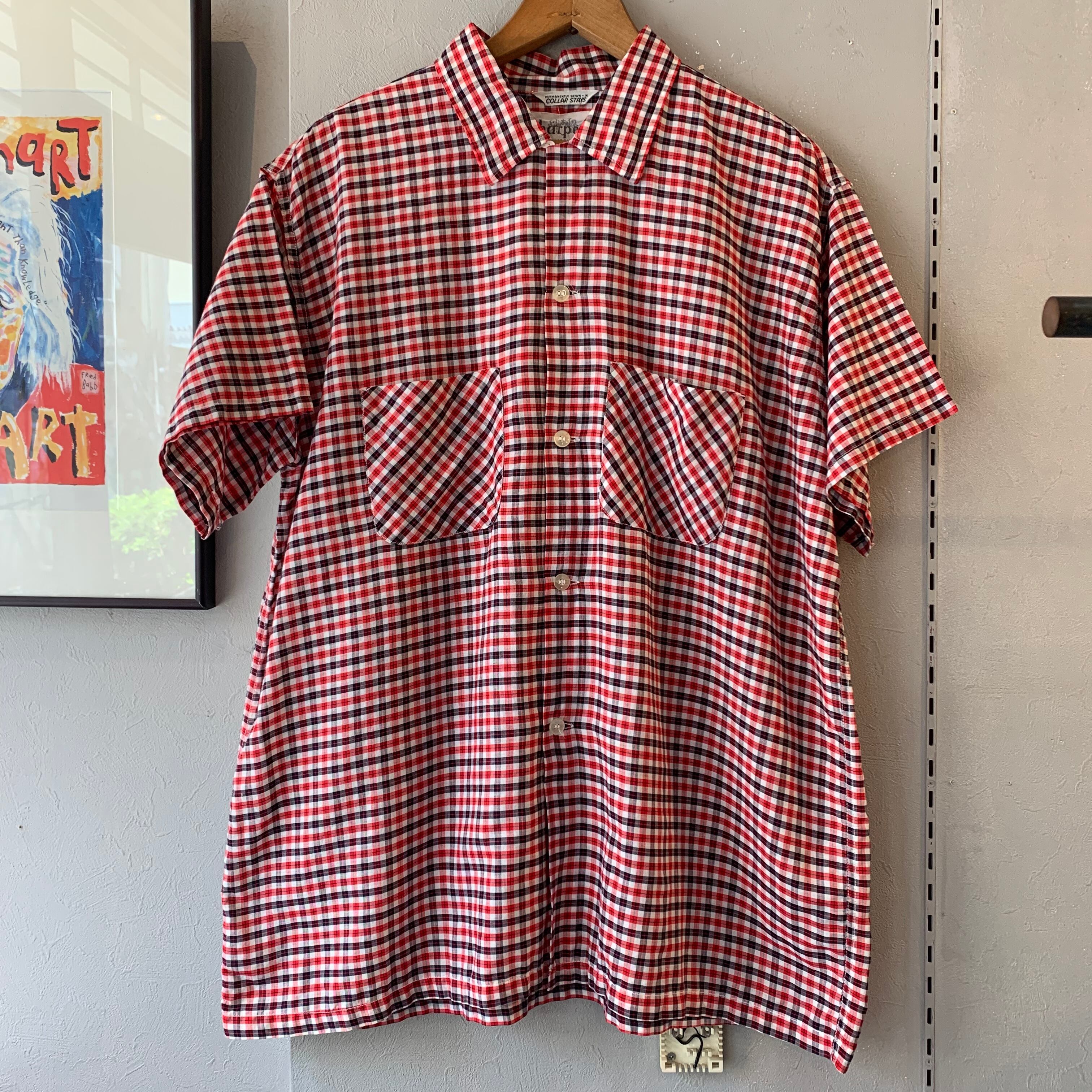 60s HARPER ループカラーシャツ ギンガムチェック 黒×白×赤 16ハーフ L