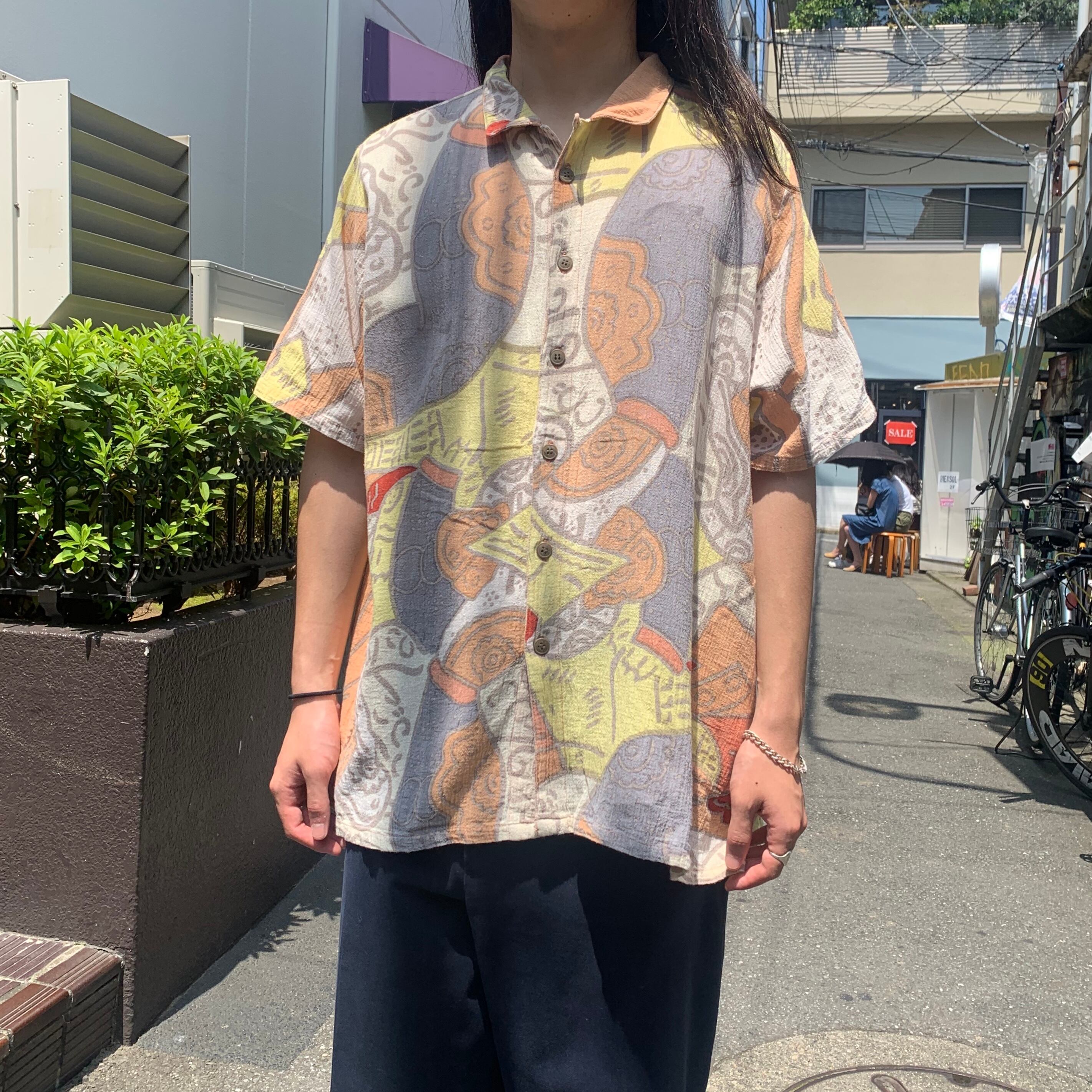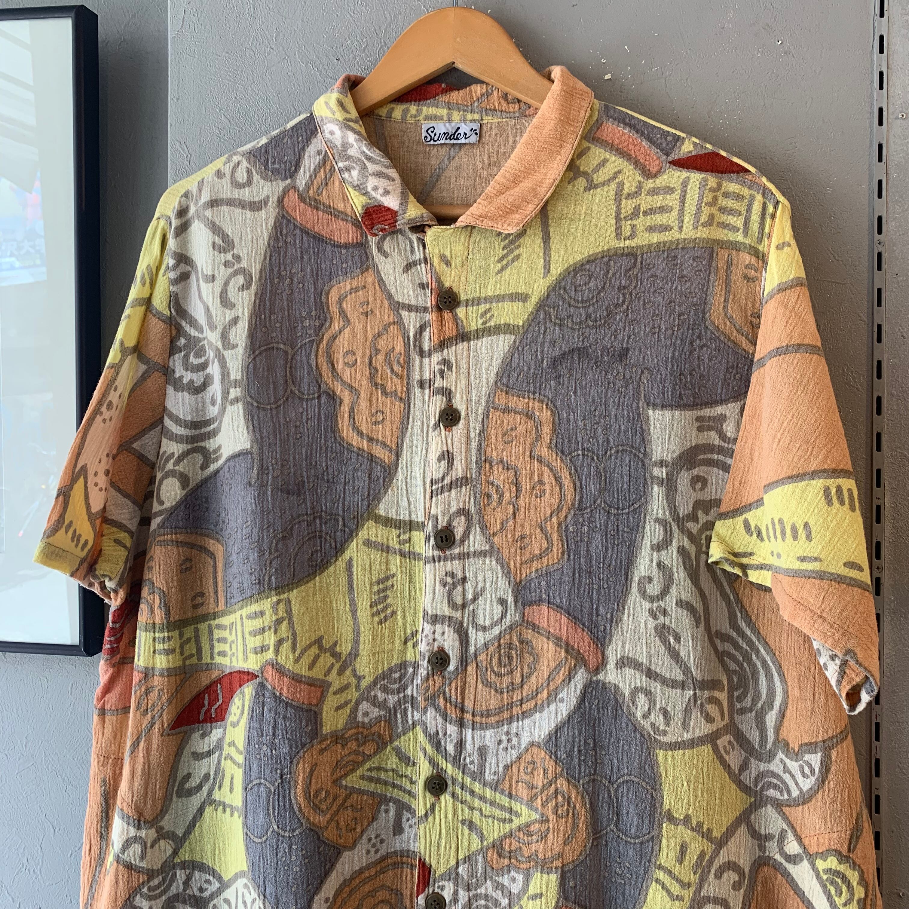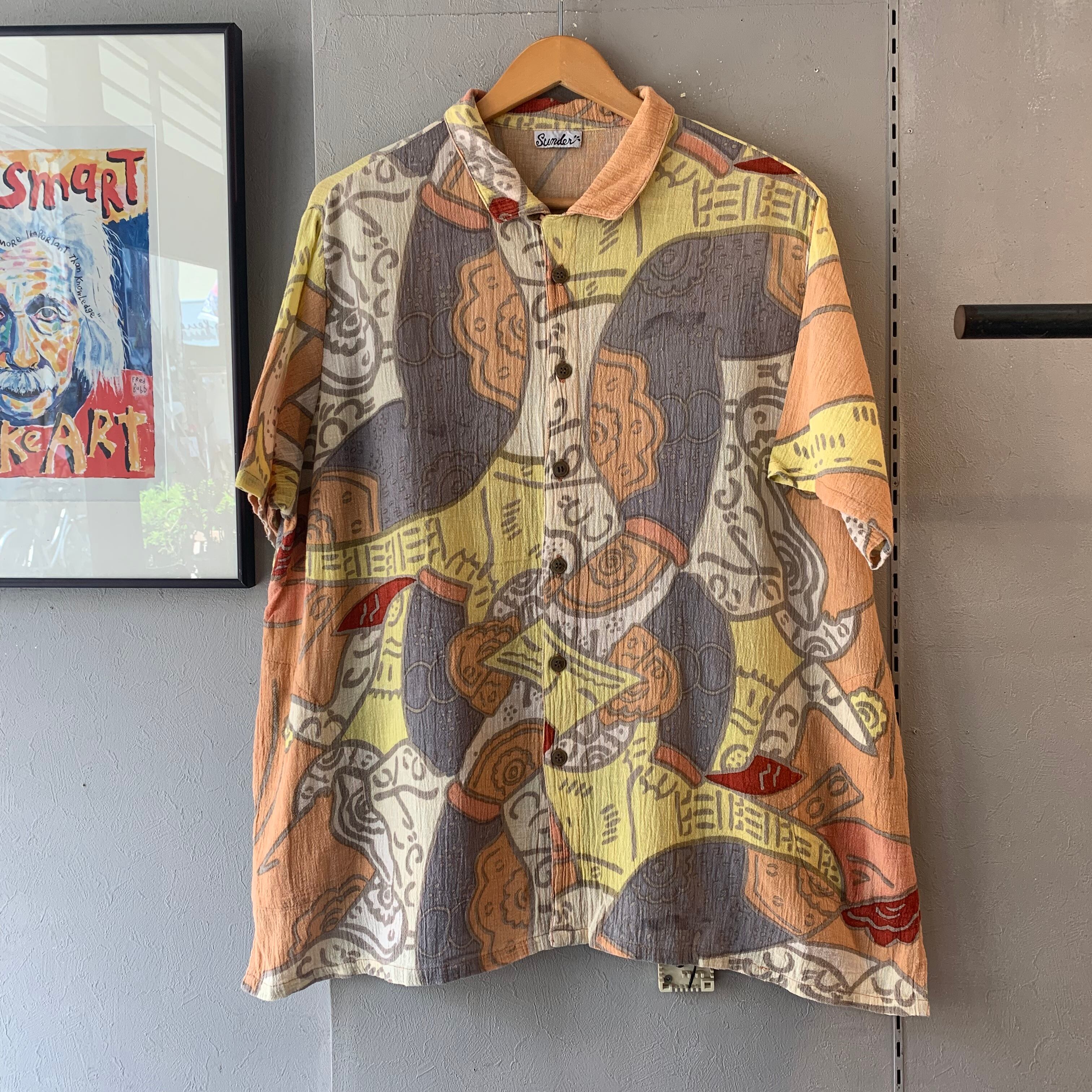 90s コットン ループカラー柄シャツ ペルーオレンジベース XL程度