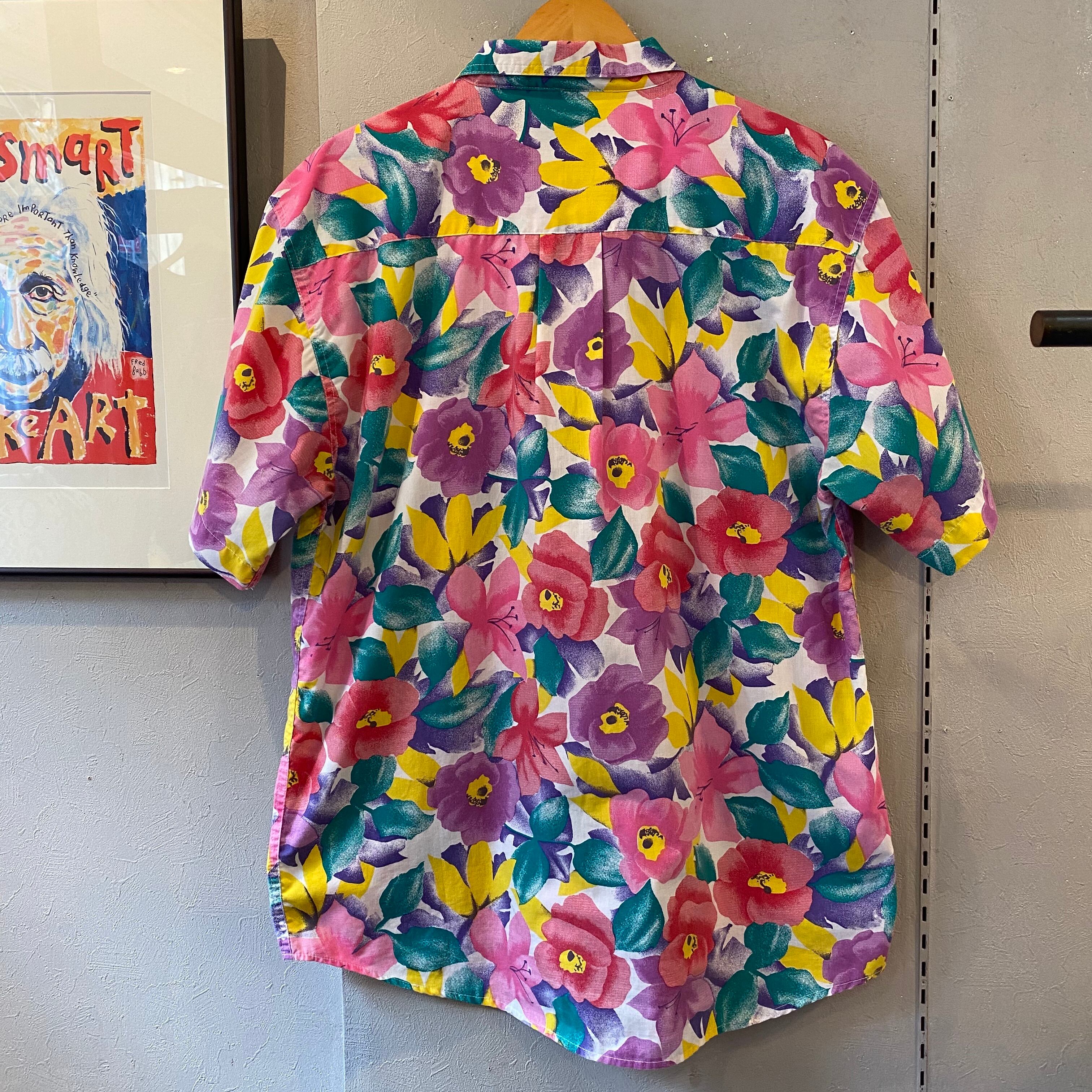 90s ループカラーシャツ コットン 花柄 ホワイトベース L