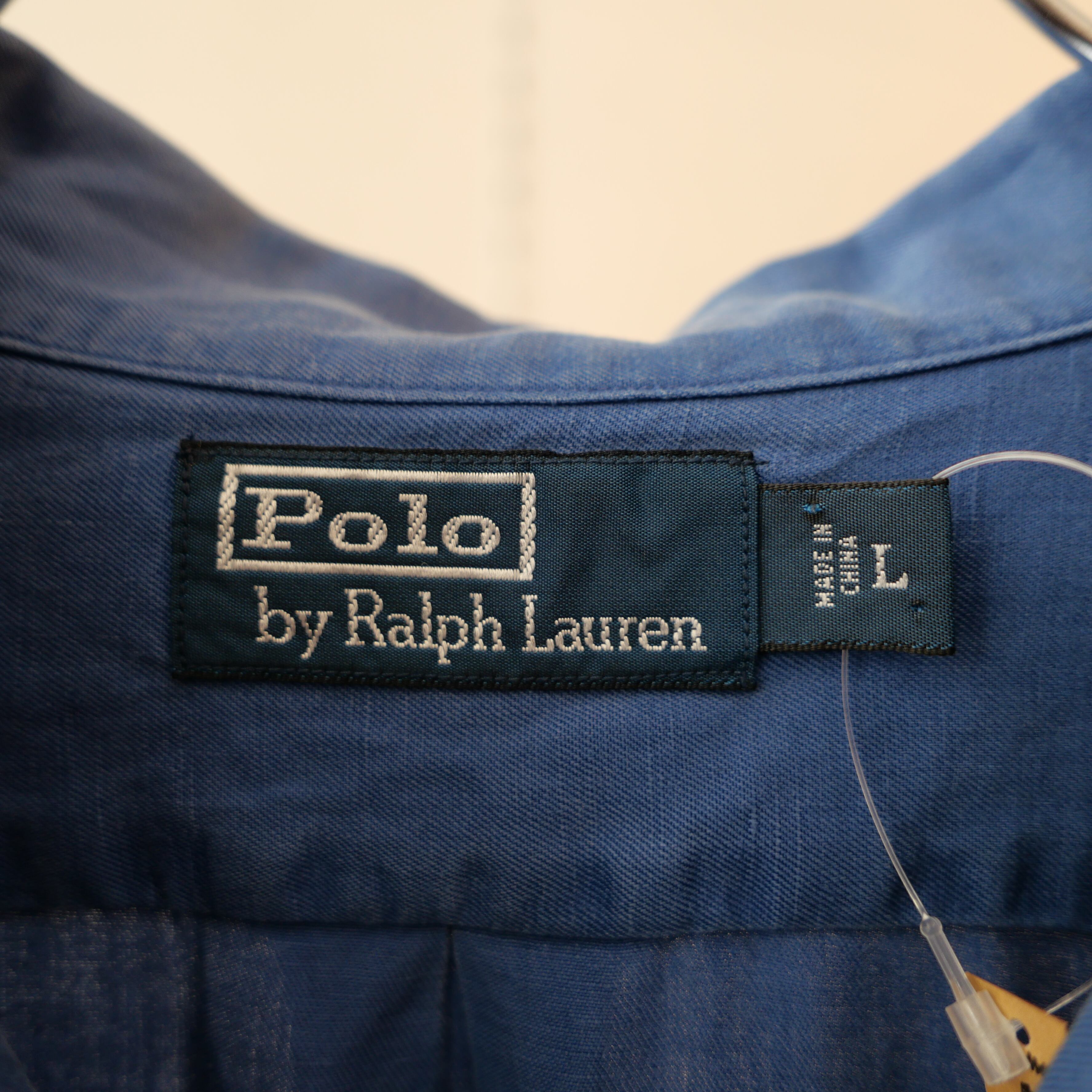 90s ラルフローレン シルク×リネン ループカラーシャツ 裾ポニー スモークネイビー L