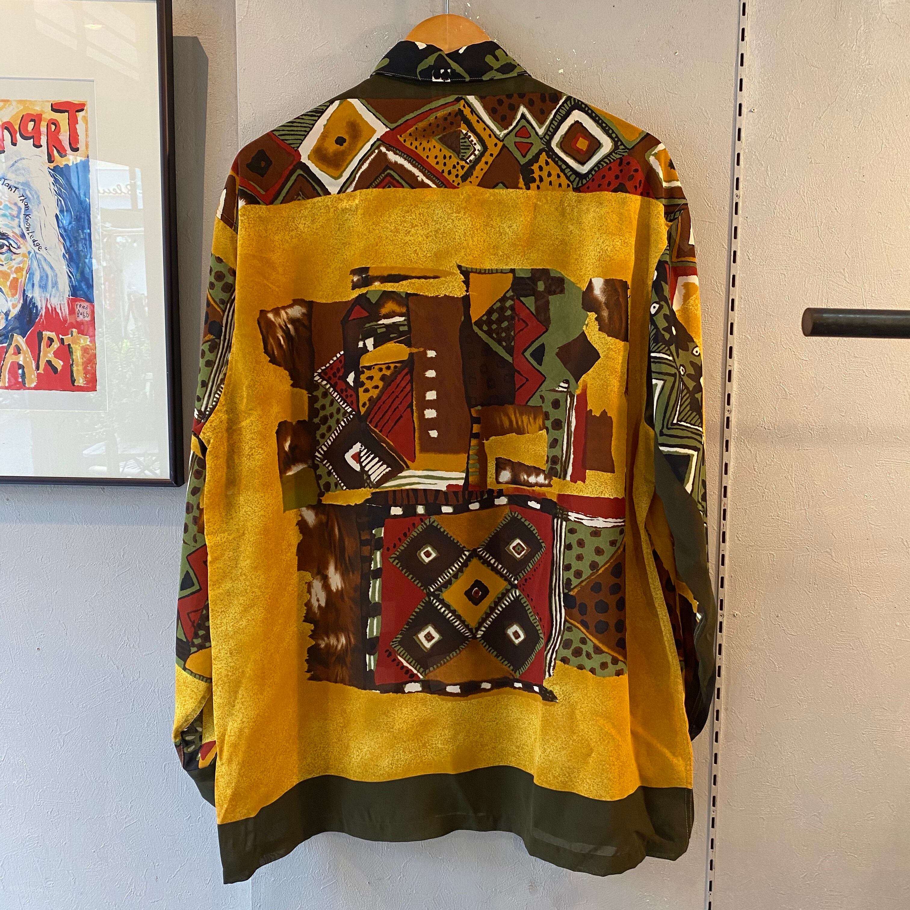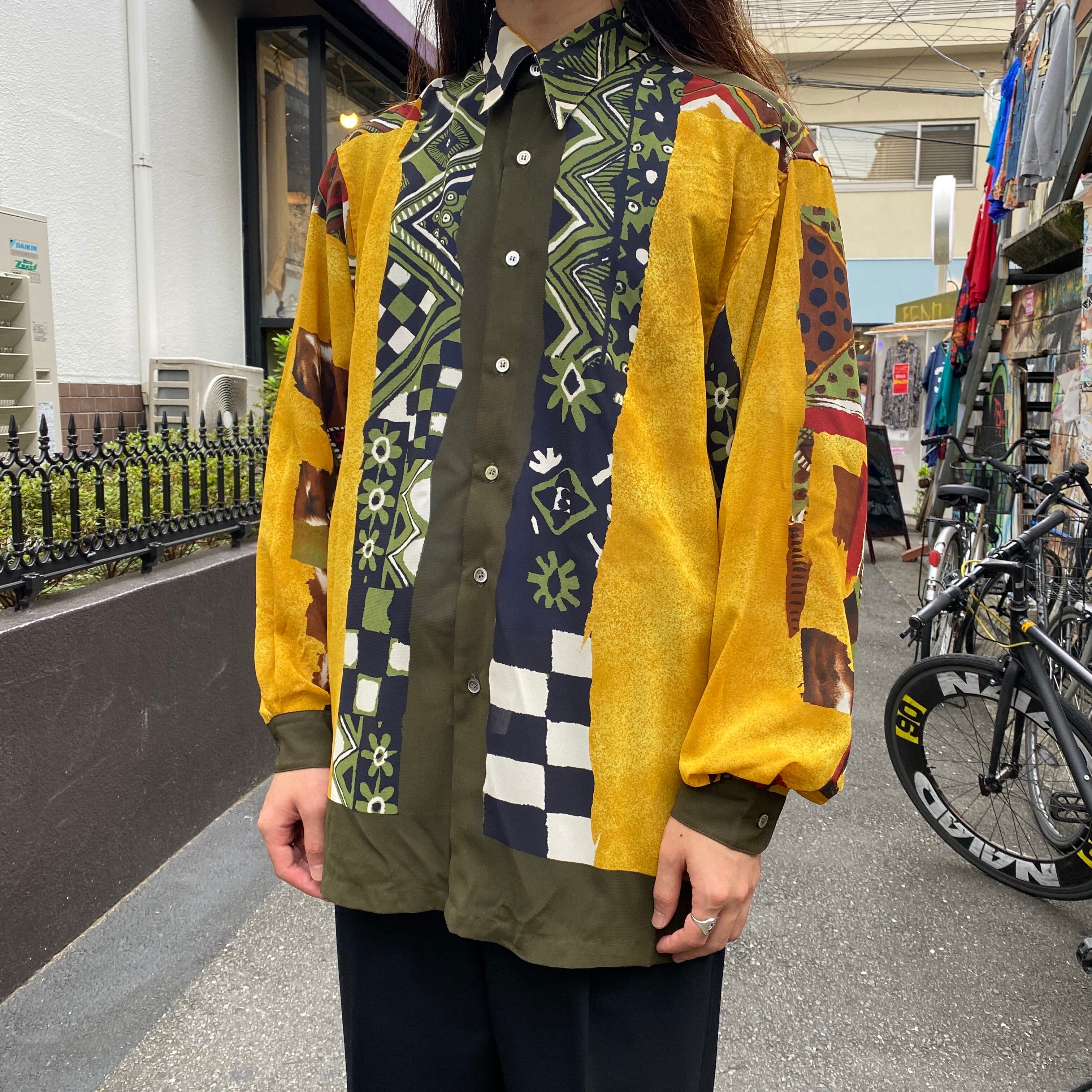 90s 切替パターン ボックスシルエット シャツベース マスタード×カーキ L